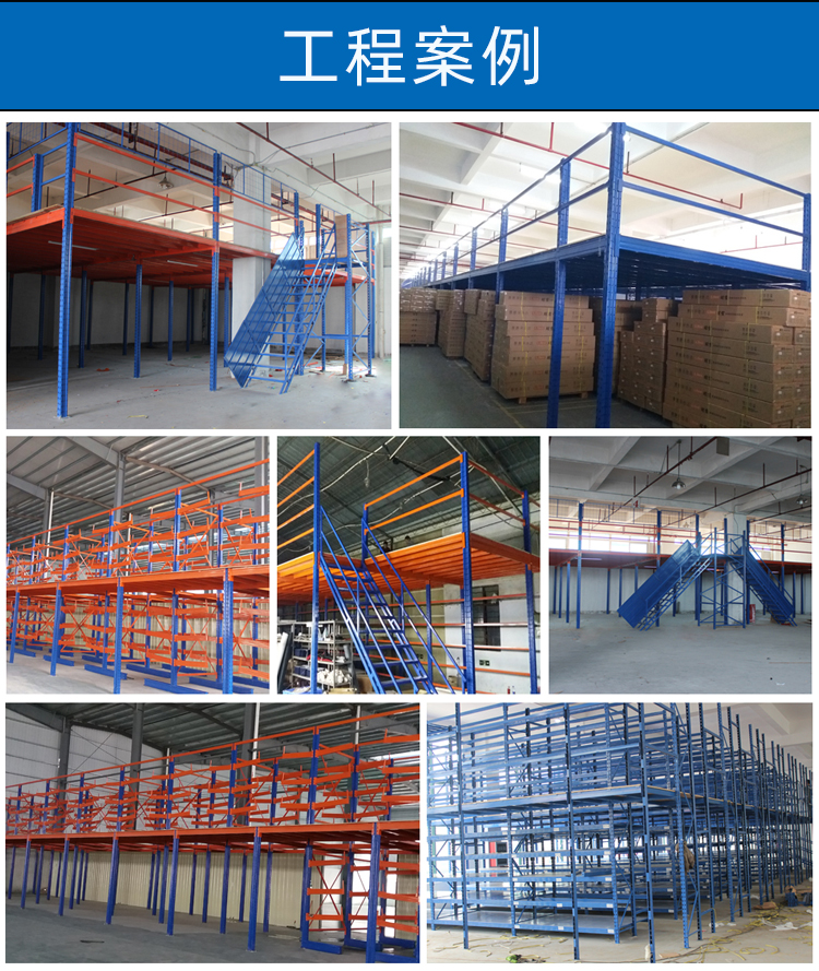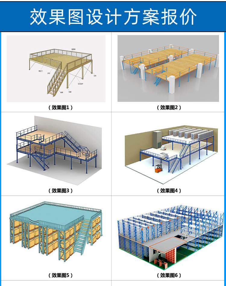 5、下層是貨架形式,上層可以是平臺(tái)也可以是貨架的結(jié)構(gòu)。底層貨架既可以存儲(chǔ)物料又是樓面的支撐,極具靈活性。