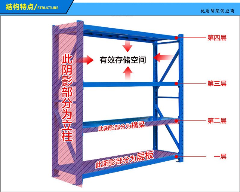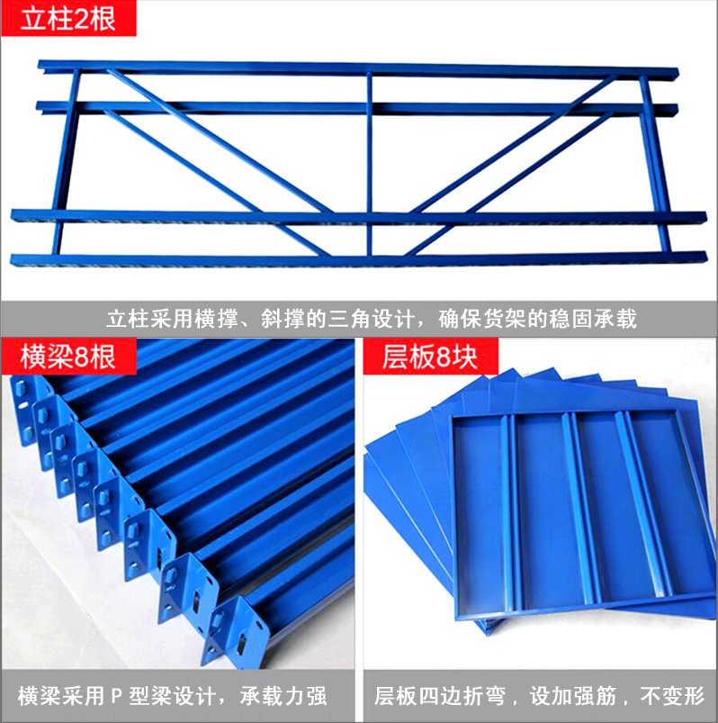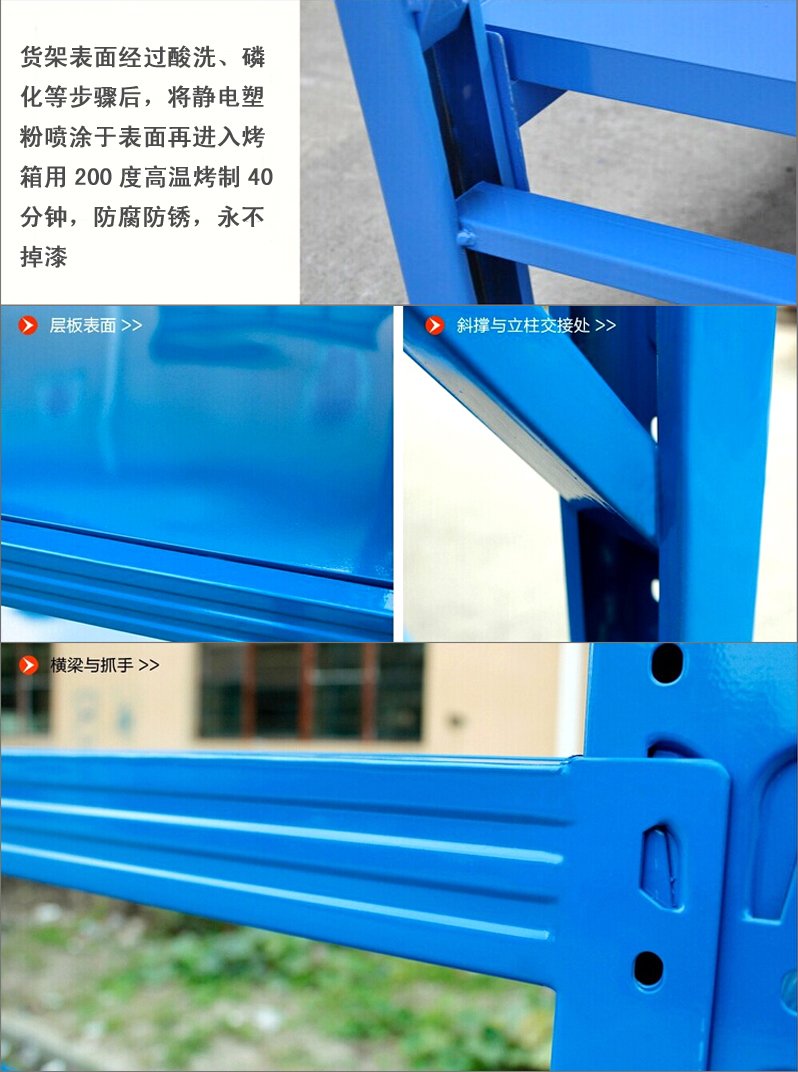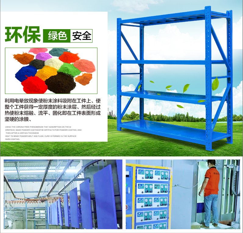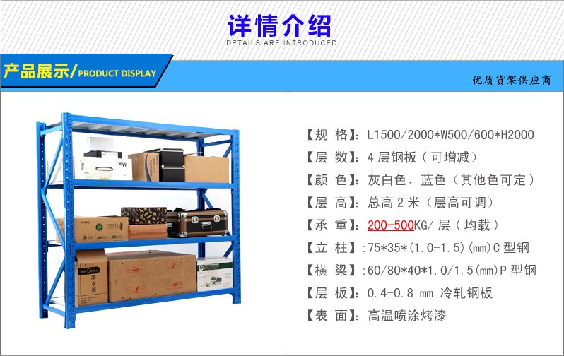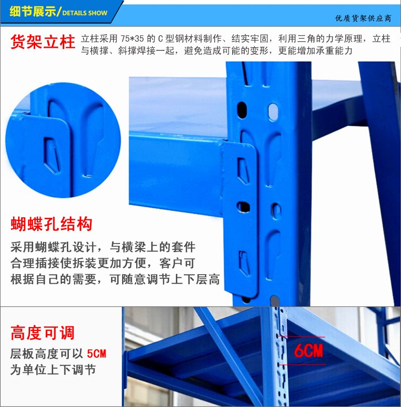 3、層板有木板和鋼板可供選擇,立柱高度設(shè)有每50mm調(diào)節(jié)孔距,可根據(jù)貨物高低調(diào)節(jié)層間使用。